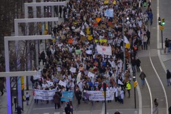 Més de 5.000 metges, facultatius i ciutadans van participar en la manifestació convocada pels Sindicats Mèdics d’Atenció Primària d’Aragó divendres per exigir al Ministeri de Sanitat i al Govern d’Aragó atendre les reivindicacions que els han dut a la vaga. A nivell nacional reivindiquen un estatut propi i que s’acabe amb unes jornades de guàrdia que suposen més de 1.000 hores a l’any, obligades i sense unes contraprestacions justes. A més, es demane al govern autonòmic millorar les condicions laborals i complir amb els acords sobre Atenció Primària firmats. Metges amb bates blanques i també famílies senceres van omplir els carrers de Saragossa, en una marxa que va eixir des del Paranimf de la Universitat i va acabar a la Plaça del Pilar, tancant d’esta forma cinc dies de vaga que, segons els convocants, han tingut un seguiment d’entorn al 85 per cent als hospitals i del 50 per cent als centres de salut.