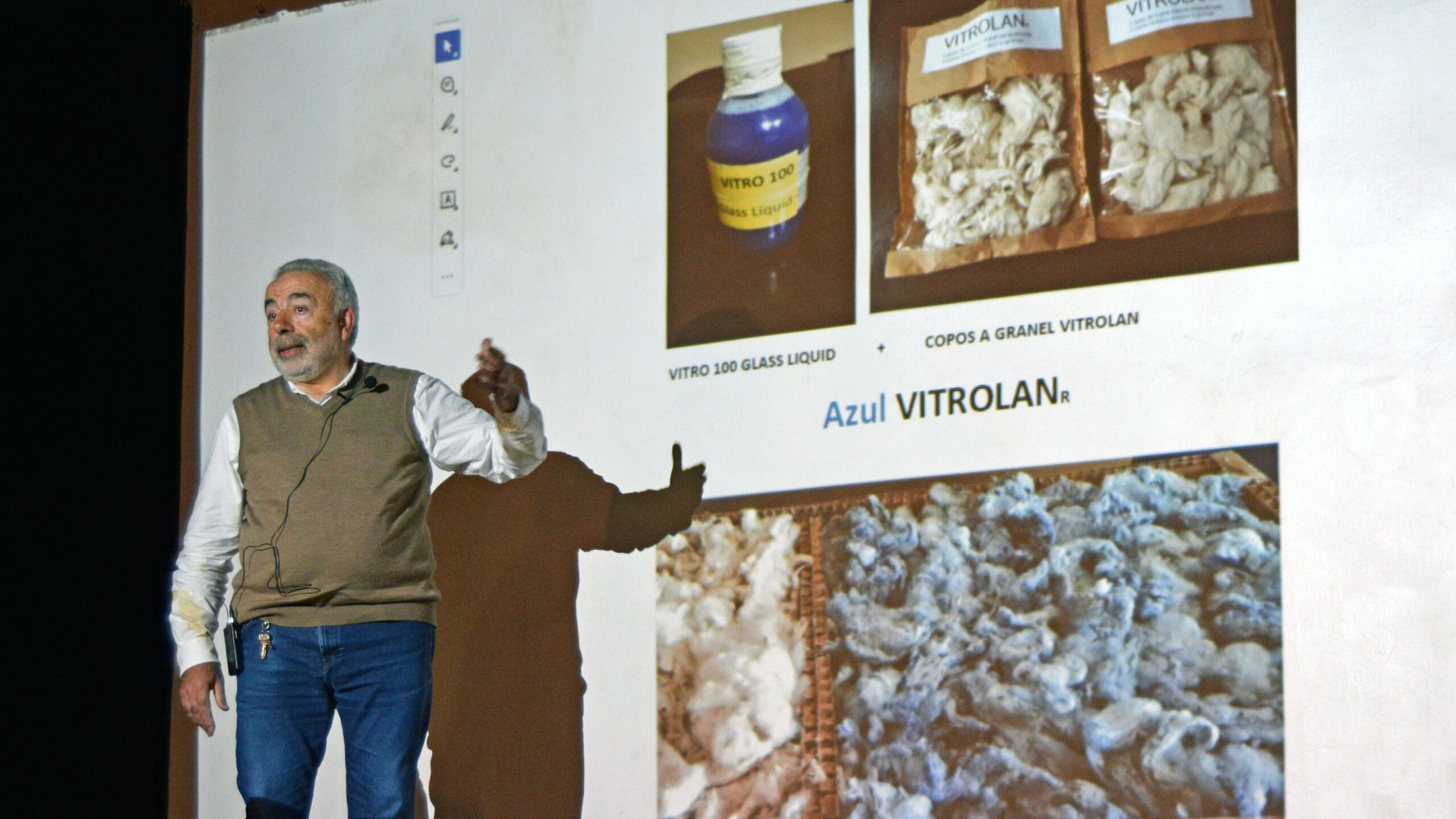 Fernando Iturbe, químic, durant la presentació de Vitrolan i els murs aïllants fets a partir de llana i mineral. Foto: R. Lombarte